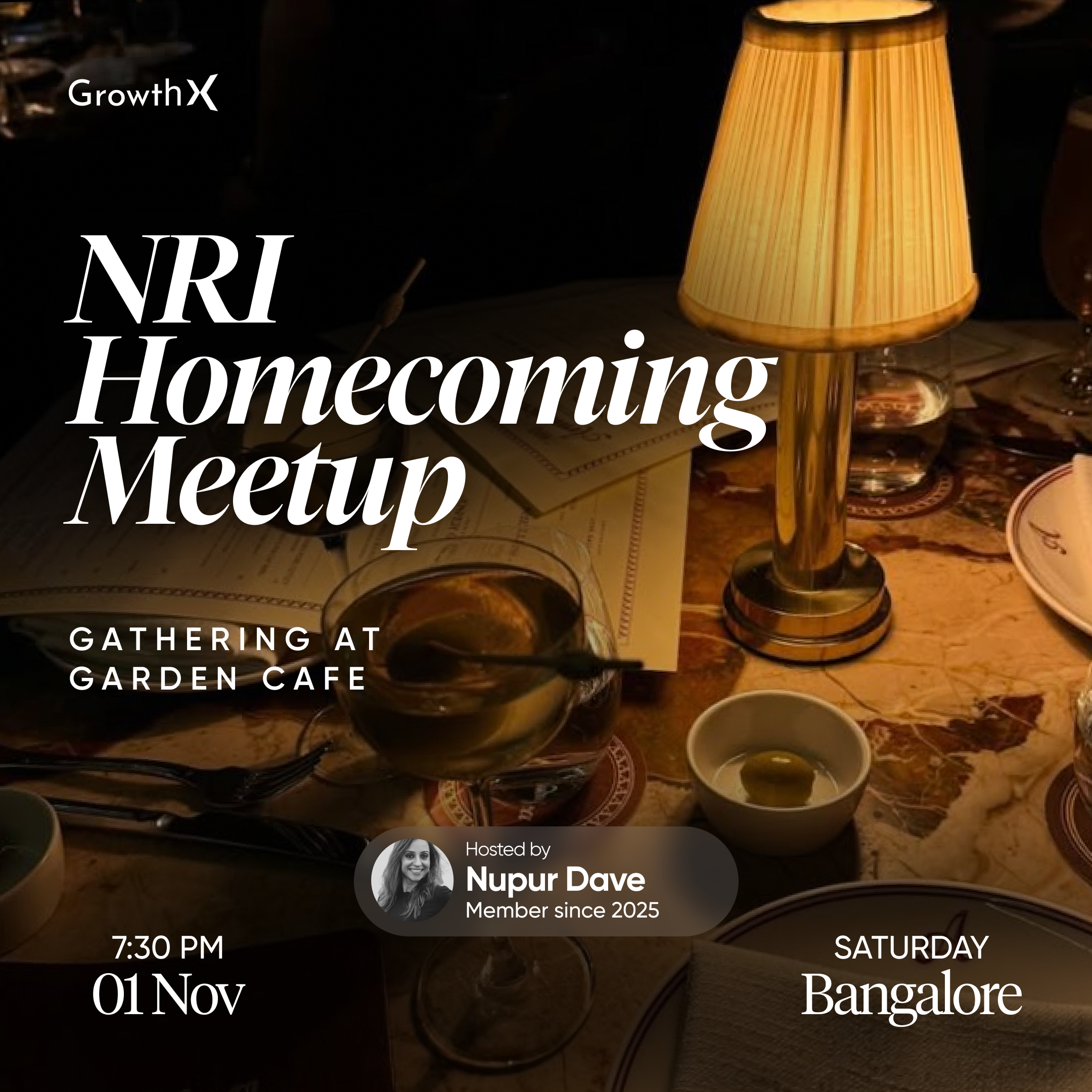 Join an exclusive evening for ex-NRIs and visiting NRIs to connect, share stories, and find your tribe. Hosted by Nupur Dave and the Zero1 Network, it’s a relaxed dinner with founders, operators, and leaders from around the world. You’ll leave with new connections, fresh perspectives, and a sense of belonging.
