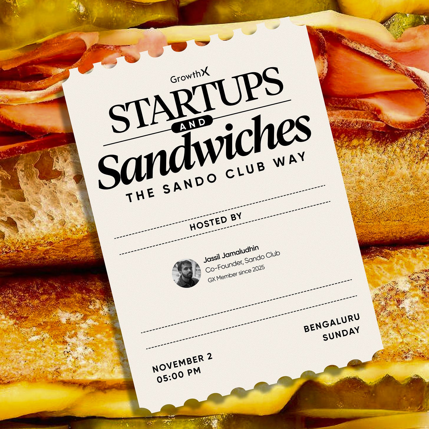 Join Sando Club founders Carl Pinto and Jassil Jamaludhinn for an exclusive night of flavor and founder stories. Experience a custom menu crafted for GrowthX and hear how two friends turned late-night grilling into Bengaluru’s cult sandwich brand. You’ll leave inspired and hungry for more.
