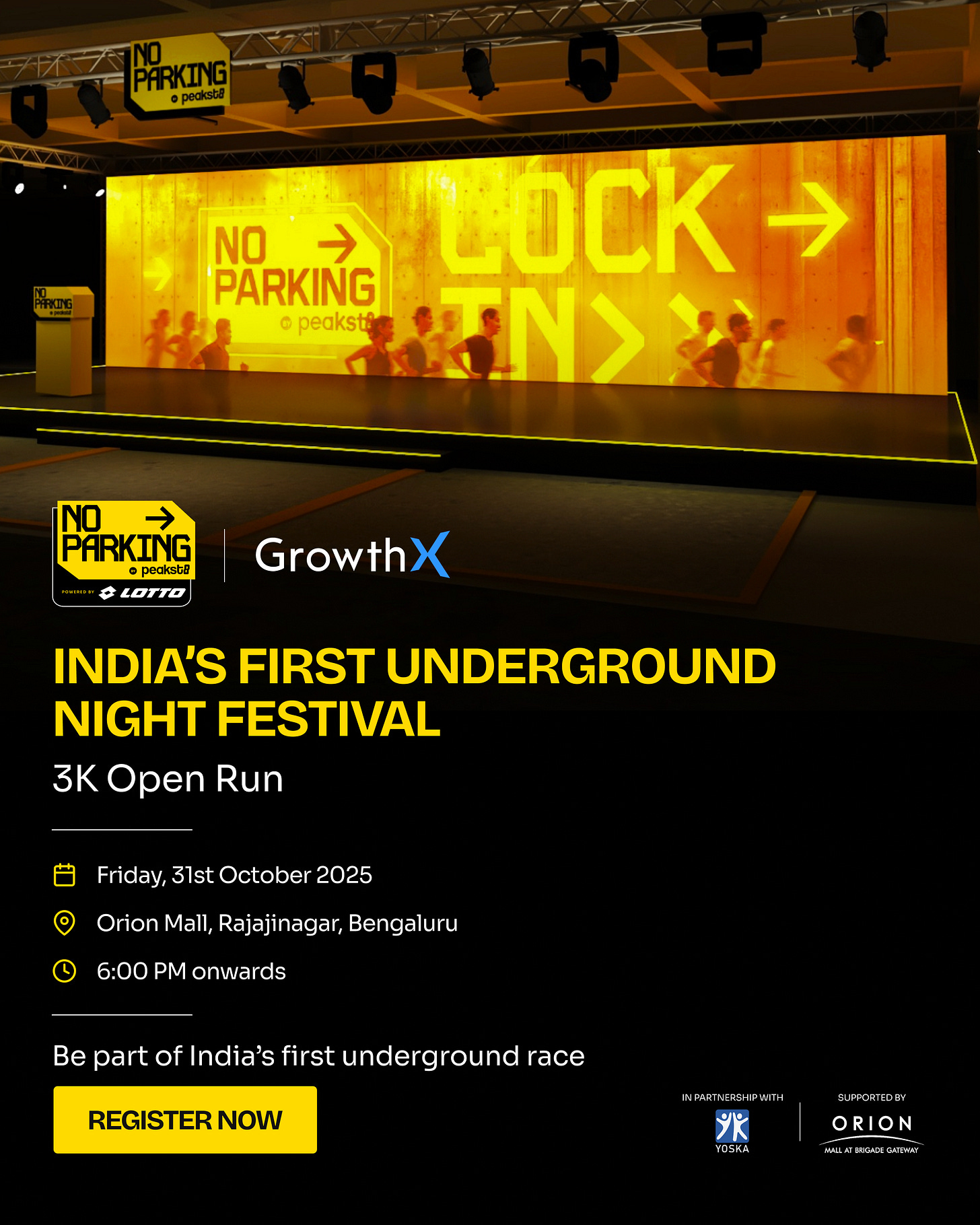 India’s first underground night-run festival, held in Orion Mall’s basement, transforms into a neon-lit arena of music, movement, and community. Join 1000+ runners, founders, and creators for a 3K sprint that celebrates grit, connection, and the joy of showing up together. Hosted by: Dilip Kumar