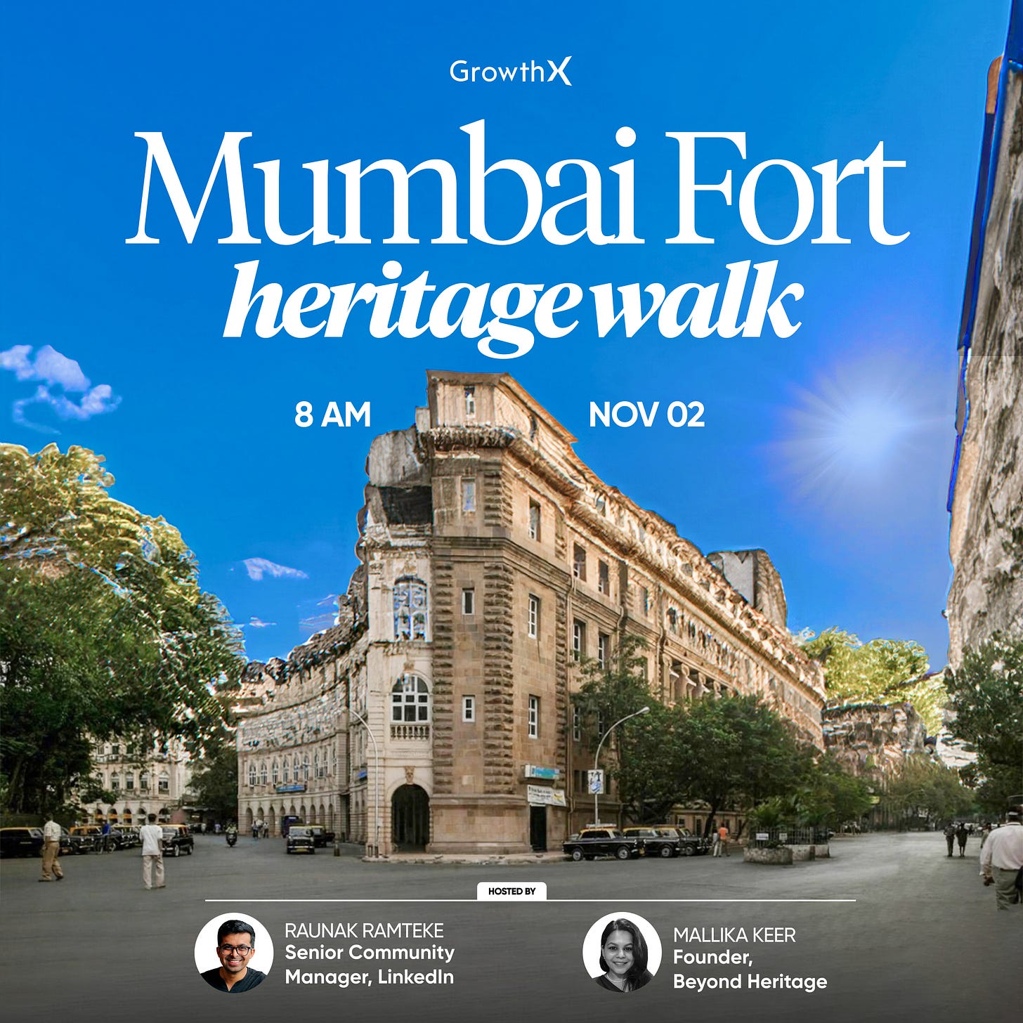 Walk through Fort’s historic lanes and uncover the stories behind Mumbai’s most iconic landmarks. From the Asiatic Society to Flora Fountain, this guided walk blends history, architecture, and real storytelling. You’ll leave with fresh perspectives and a deeper connection to the city’s roots. Hosted by: Raunak Ramteke & Mallika Keer